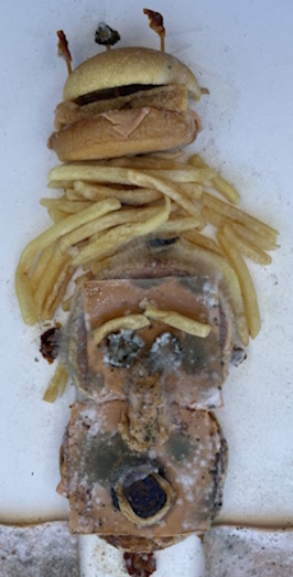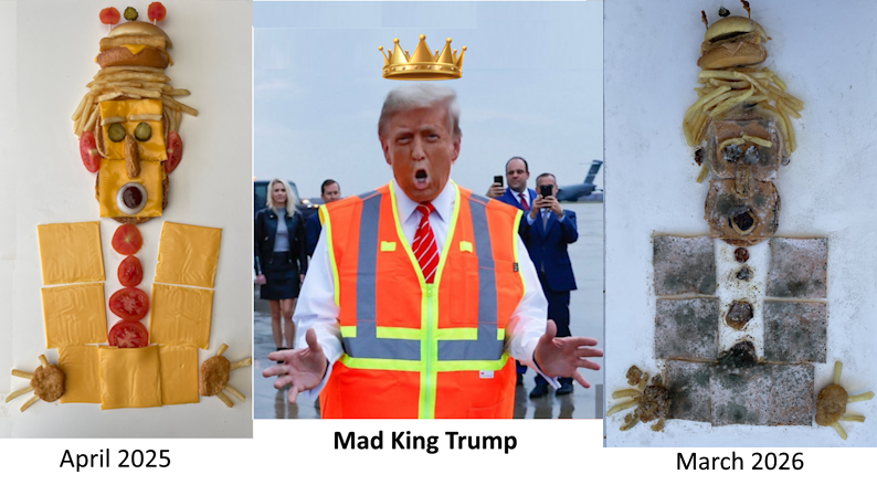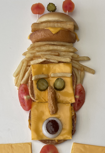 In my dismay at the return of Mad King Trump, and inspired by Guiseppe Arcimboldo's 1591 portrait of Holy Roman Emperor Maxmillian II portrayed in fruits, vegetables, and flowers, I created a portrait of Trump using his favorite food - McDonald's [1].
